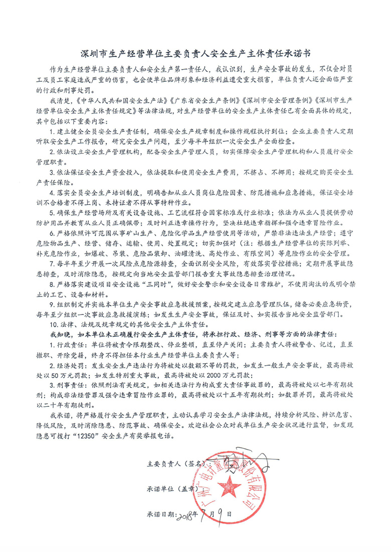 深圳市生產經營單位主要負責人安全生產主體責任承諾書