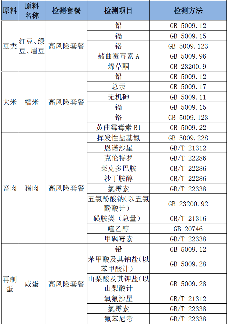 粽子主要原料檢測;粽子型式檢驗、國家監督抽檢高風險檢測套餐、粽子產品生產許可前試制產品檢測: