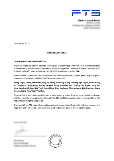 公司已獲得中國(guó)商飛試驗(yàn)服務(wù)商授權(quán)認(rèn)可,通過(guò)了FAA和EASA現(xiàn)場(chǎng)DO-160測(cè)試審核以及T-PED評(píng)估、測(cè)試,獲得國(guó)際適航檢測(cè)項(xiàng)目相關(guān)資質(zhì),并承擔(dān)了中國(guó)大飛機(jī)、美國(guó)聯(lián)邦航空管理局(FAA)、歐洲航空安全局(EASA)等相關(guān)機(jī)載系統(tǒng)設(shè)備試驗(yàn)項(xiàng)目,在航空產(chǎn)業(yè)產(chǎn)品質(zhì)量管控上有著多年技術(shù)積累和扎實(shí)經(jīng)驗(yàn)。