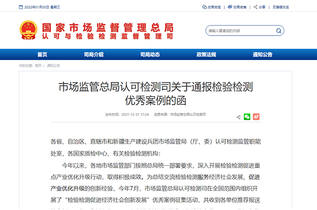 2021年7月,市場監管總局認可檢測司在全國范圍內組織開展了“檢驗檢測促進經濟社會創新發展”優秀案例征集活動,共收到各單位推薦報送的案例315個。為進一步發揮優秀典型的示范引領作用,綜合考慮案例的創新性、實用性、效益性、規范性等因素,經專家評審出50個“檢驗檢測促進經濟社會創新發展”優秀案例,引導廣大檢驗檢測機構借鑒學習優秀案例,進一步推動質量提升和檢驗檢測助推產業優化升級行動,形成更多可復制、可推廣的經驗和做法,帶動行業向專業化和價值鏈高端延伸,不斷做優做強。