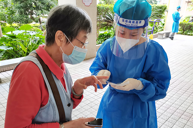 市場綜合黨支部黨員趙敬居住在白云區,此前早已下沉社區多次支援,在4月8日當天更是從晚上8點連續戰斗到第二天早上6點。“累一點不算什么,黨員就是要關鍵時刻站出來,重要時刻沖上去,這是我應該做的。”趙敬說。這次來到白云支援點,她主要負責維護排隊秩序,一邊檢查居民健康碼和核酸碼,一邊關注老人、孕婦等群眾,把他們指引到綠色通道??此坪唵?、重復的工作,卻時時考驗著志愿者們的耐心、細心。在這場爭分奪秒的疫情阻擊戰中,每個人都是不平凡的“逆行者”。