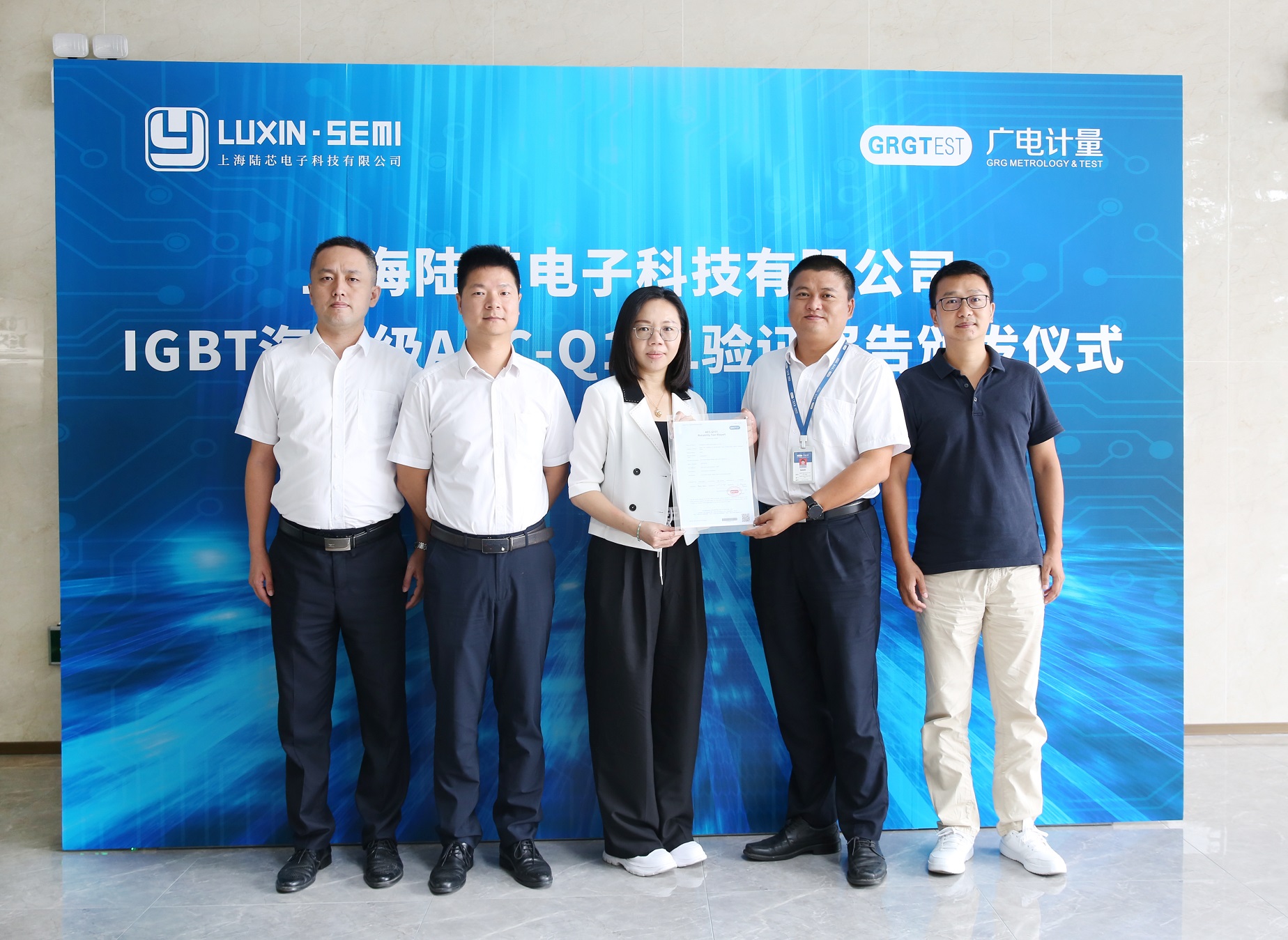 9月20日,廣州廣電計(jì)量檢測股份有限公司(簡稱:廣電計(jì)量)攜手上海陸芯電子科技有限公司(簡稱:上海陸芯),成功舉辦“廣電計(jì)量與上海陸芯合作交流會(huì)暨上海陸芯IGBT汽車級AEC-Q101驗(yàn)證報(bào)告頒發(fā)儀式”。上海陸芯副總經(jīng)理黃冬榆、市場總監(jiān)曾祥幼,廣電計(jì)量總經(jīng)理助理陸裕東、半導(dǎo)體技術(shù)副總監(jiān)李汝冠、失效分析業(yè)務(wù)副總監(jiān)代蕾等雙方代表人員出席了本次活動(dòng),隨后一同參觀了廣州無線電集團(tuán)企業(yè)展廳和廣電計(jì)量實(shí)驗(yàn)室。