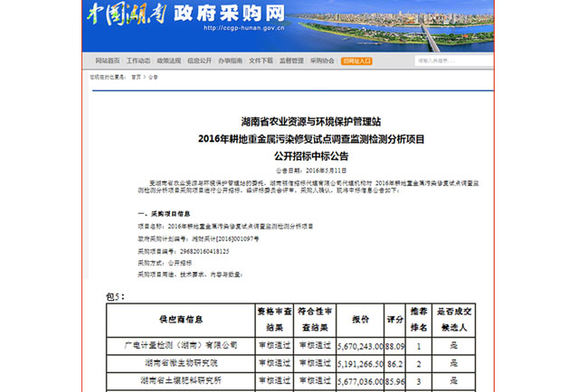 5月11日,湖南省政府采購網(wǎng)正式發(fā)布公告,廣電計量湖南子公司被確認(rèn)為湖南省農(nóng)業(yè)資源與環(huán)境保護管理站2016年耕地重金屬污染修復(fù)試點調(diào)查監(jiān)測檢測分析項目中標(biāo)單位,中標(biāo)涉及樣品15927個。這是公司繼2014年中標(biāo)長株潭耕地“土壤-農(nóng)產(chǎn)品-水樣”檢測分析項目和2015年“土壤-農(nóng)產(chǎn)品-水樣-底泥”樣品檢測分析項目后,再一次順利中標(biāo)國家級項目,參與國家重金屬污染耕地修復(fù)綜合治理項目的工作。