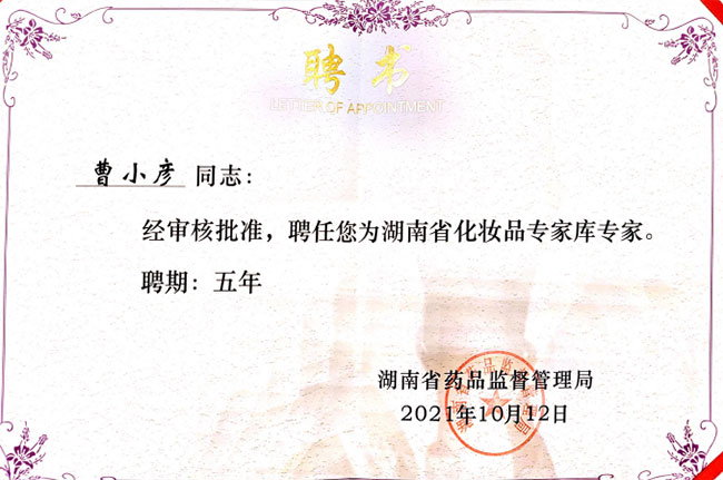 2021年12月2日,廣電計(jì)量食品與農(nóng)產(chǎn)品檢測事業(yè)部總經(jīng)理曹小彥被聘為湖南省市場監(jiān)督管理局化妝品專家?guī)斓谝慌霂鞂<遥蔀闄z驗(yàn)檢測組14名專家之一。