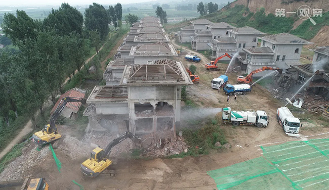 2018年8月14日,大型機(jī)械對(duì)西安市鄠邑區(qū)蔣村鎮(zhèn)的違建別墅進(jìn)行拆除。(新華社記者 邵瑞 攝)